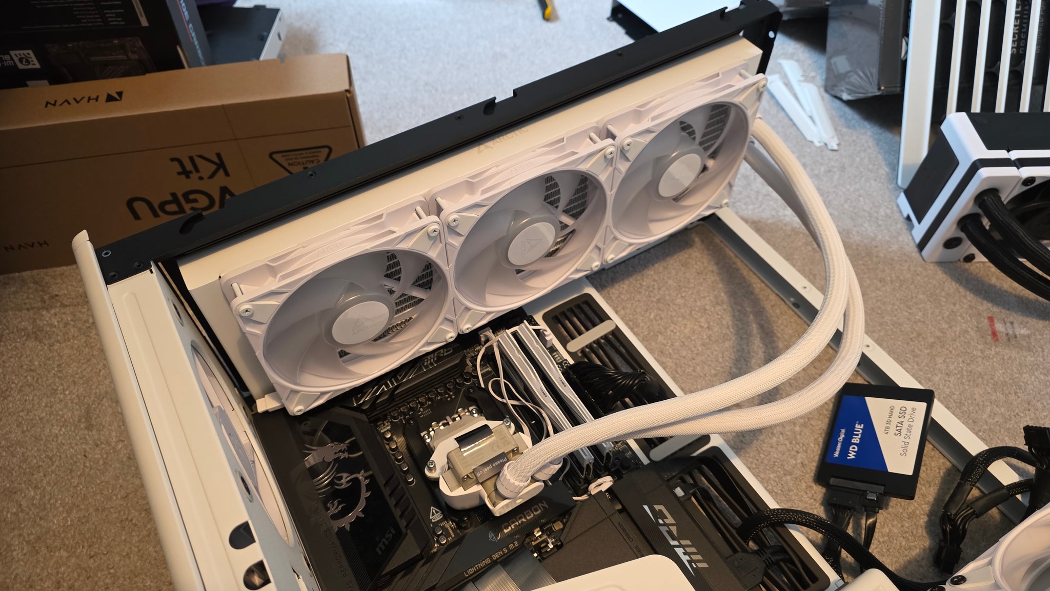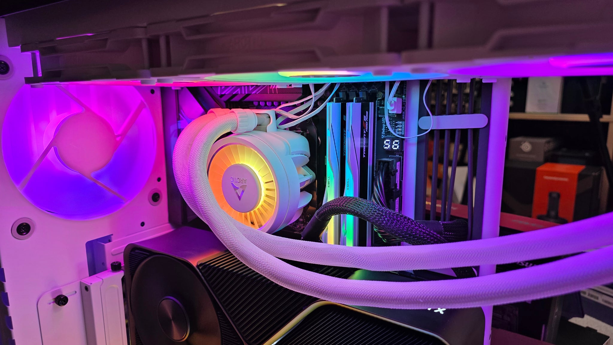 Attribution Here’s the Arctic Liquid Freezer 3 Pro A-RGB install, starting with the CPU block installed the right way up, then later upside-down to accommodate the vertical GPU mount.