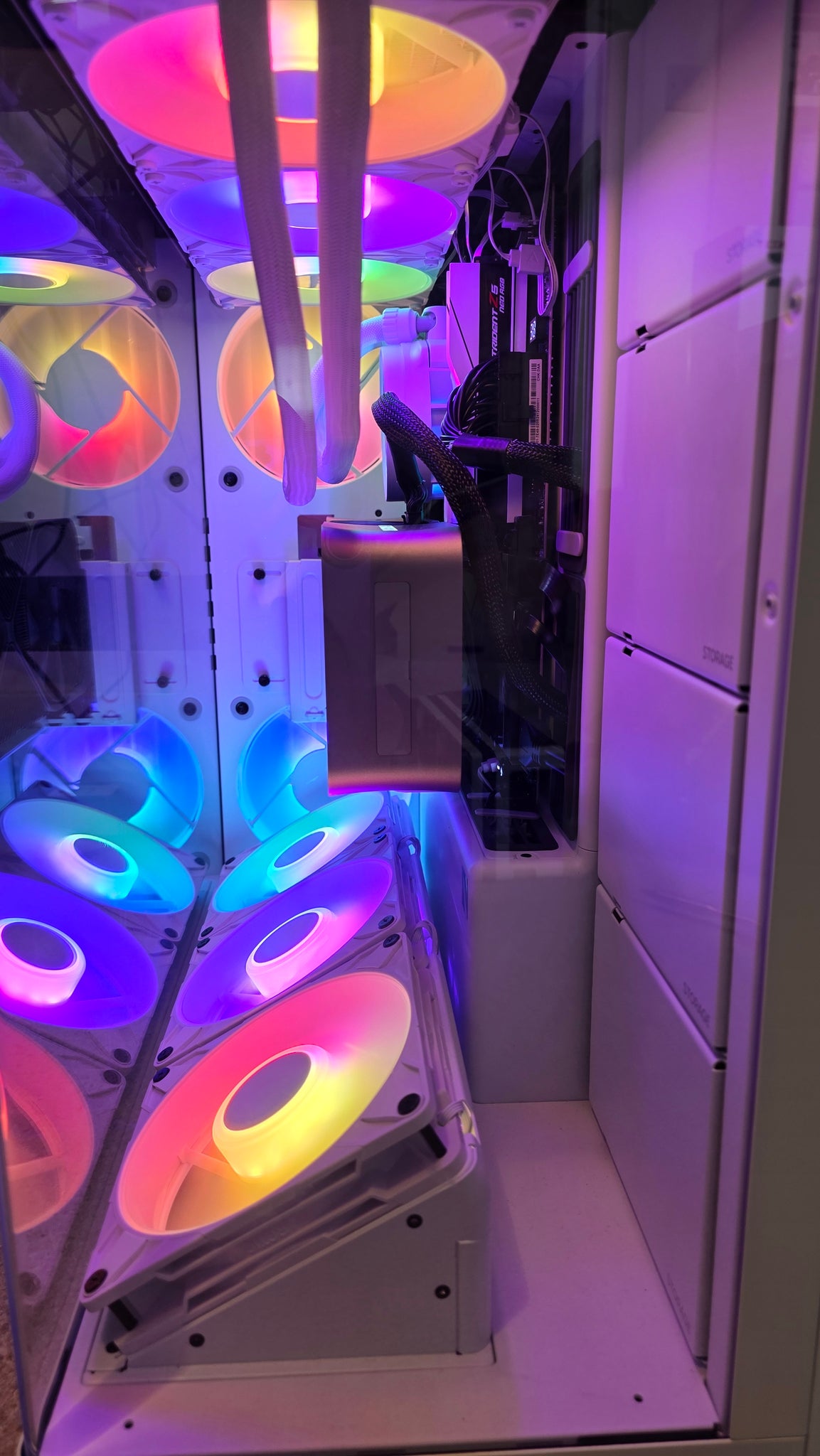 The goal with vertical GPU placement is to make sure there’s a good amount of space between the card and the glass, so that hot air leaving the card has a chance to be directed away (in this case, by the three fans below). There’s a good two or three inches between the GPU and the side glass here, so that’s good enough for me.