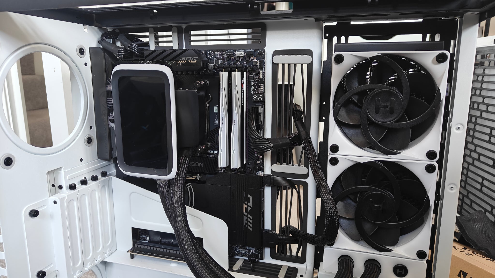 Here’s how my work PC looked before I started this project, with the Hyte Thicc Q60 240mm AiO installed. I dig the white/black colour scheme, but fan noise was relatively high. |
