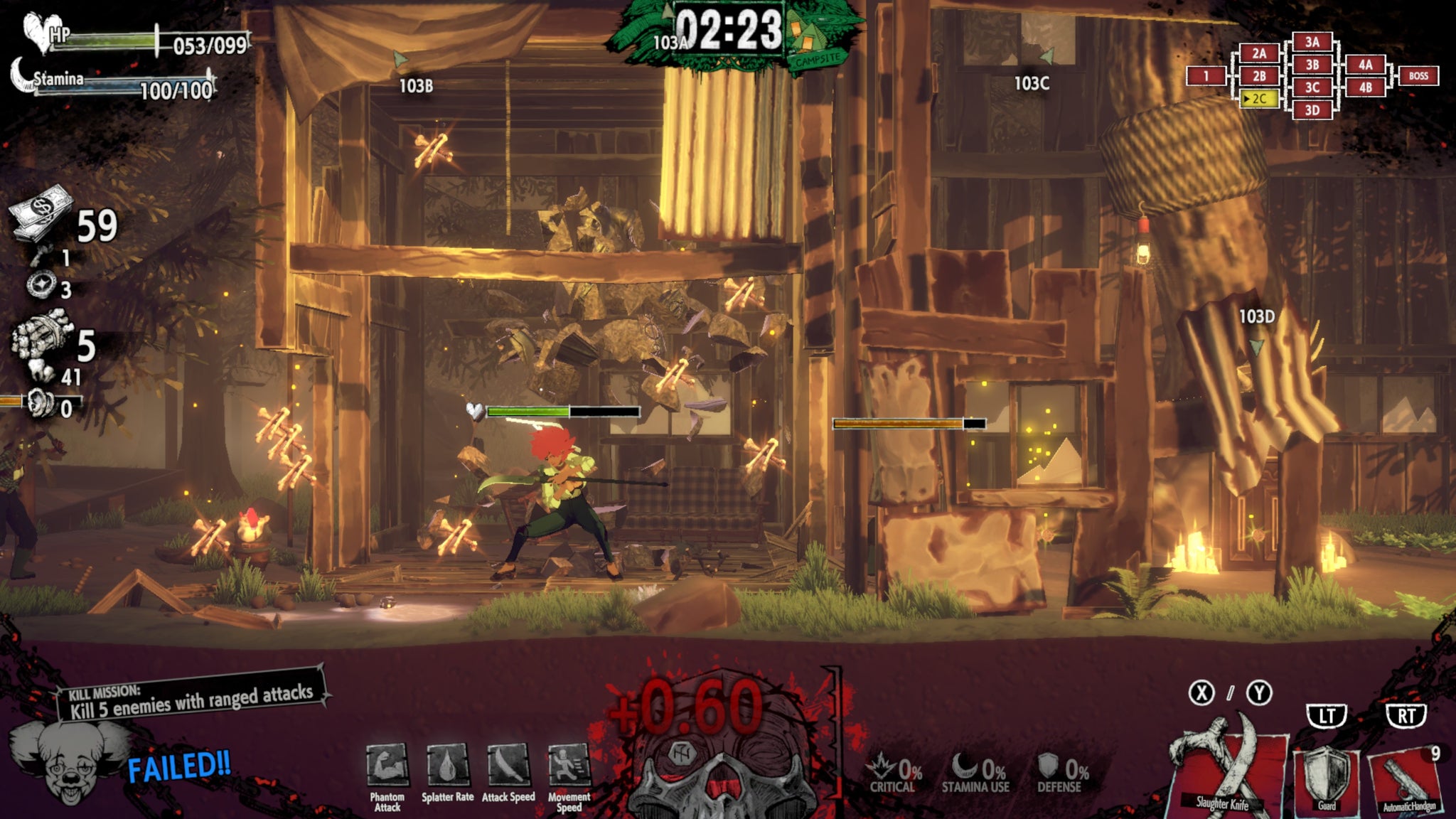 One run might take you on a misty morning jaunt through terror, while the next time you visit the level, it’ll be during a midnight downpour and you’re suddenly three times taller than you were before. And if you want to mix things up even further, there are optional Bondage Rules (don’t ask), introducing handicaps – no melee, no dodging, 1HP mode, lethal water, and so on – for an extra element of risk and reward. It adds a bit of variety to the inherently repetitive roguelike formula, and there’s a further twist in each stage’s comically incongruous doors. Passing through a door takes you along a different path on the way to the boss, but also awards you a random temporary boost – perhaps more health or a stronger attack – you can reclaim from your body on the next run-through. Some doors initiate challenges to complete on-the-fly, while others take you to more discrete areas with minigame-like rules.