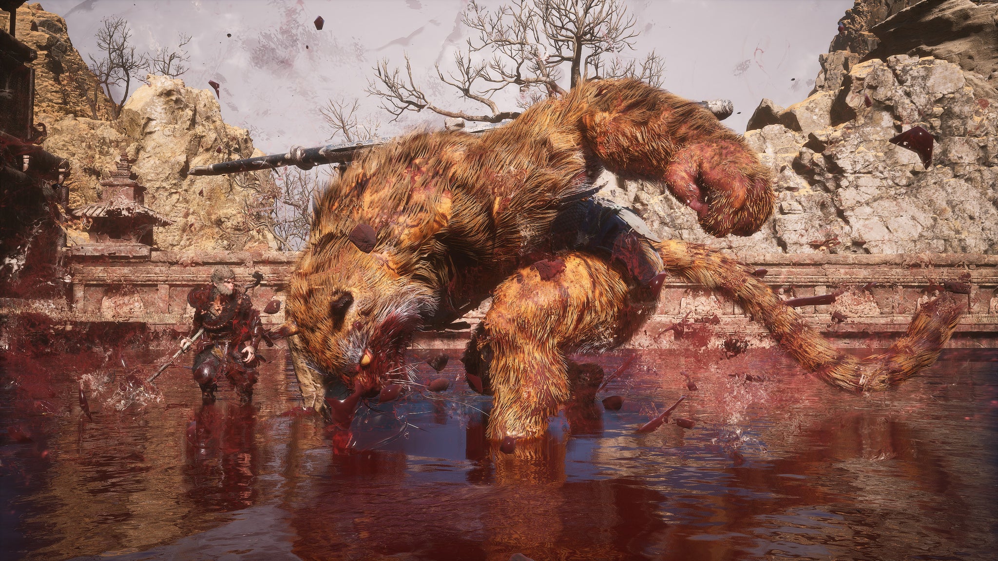 But now, after spending upwards of 40 hours retracing the steps of its titular simian hero as the silent but deadly Destined One, Black Myth emerges as a game that frustrates more than it delights. Its plentiful supply of grand, sweeping boss battles set the heart alight at regular intervals, its mythological menagerie bristling with the same kind of malicious energy and intent as their FromSoft equivalents. They are the tentpoles that hold this game aloft, their sharp claws, vicious fangs and powerful hoofs often tearing up the screen in exquisite and sumptuous detail. Indeed, they’re the kind of bosses that will probably go down as some of the most dramatic of this generation, with its glistening dragons that rage across icy lakes and rippling pools, muscular tigers that sup in temples of blood, and giant bears, wolves, rats and spiders that command the elements to devastating effect.