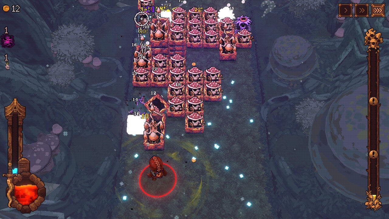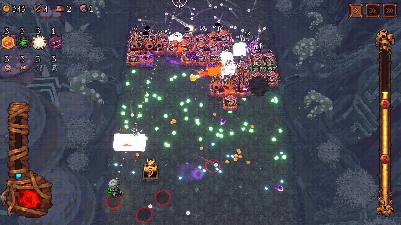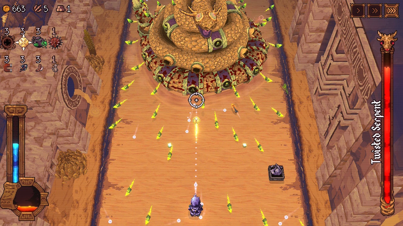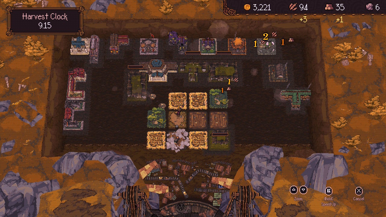This, deep breath, is a lot of Ball x Pit. A laboratory of damage-dealing, and, as is often the case with roguelite RPGs, a laboratory of self: who do I want to be for this run. But there’s still more. And this involves what you do between runs. Back home, at the top of the pit, you can spend the resources you collect in runs and build a little town, planting crops and placing any buildings you’ve unlocked, which will give your characters stat boosts, perhaps, or even unlock new characters. This town must be harvested by sending out little farmer types who act just like the weapons you’re using on runs, bouncing off walls, collecting grain and rock and building structures as they go. It’s Breakout whichever way you look.