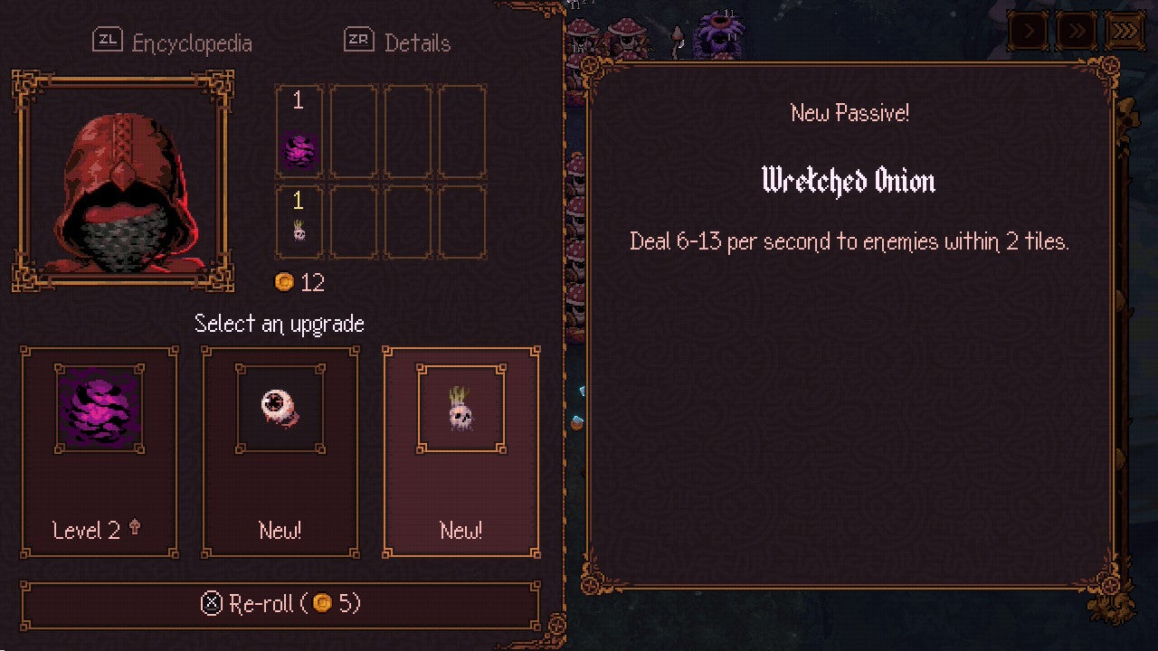 Add in those different level themes – sand and ice and that kind of thing; the fungal level is an absolute pig – and then add in different heroes you can unlock, who all change the way you approach things. My favourite of these is a character who makes all your levelling choices for you. It’s like a little of Marvel Snap‘s Agatha Harkness crept into the game. My second favourite is the twins, who have half the power but double the weaponry, and their aims are inversions of each other’s. (My least favourite will probably be my favourite in a few days: they attack from the back of the stack while moving around at the front. Gosh, they’re hard to get to grips with.)