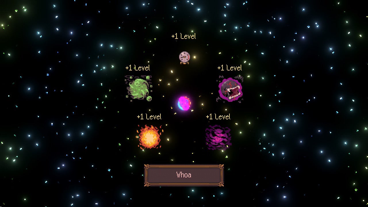 Toggle screen shake and rumble. Manually activate level-up screen, allow slower game speed, switch between pixel and high-res fonts, disable swirling background and flashing colours.