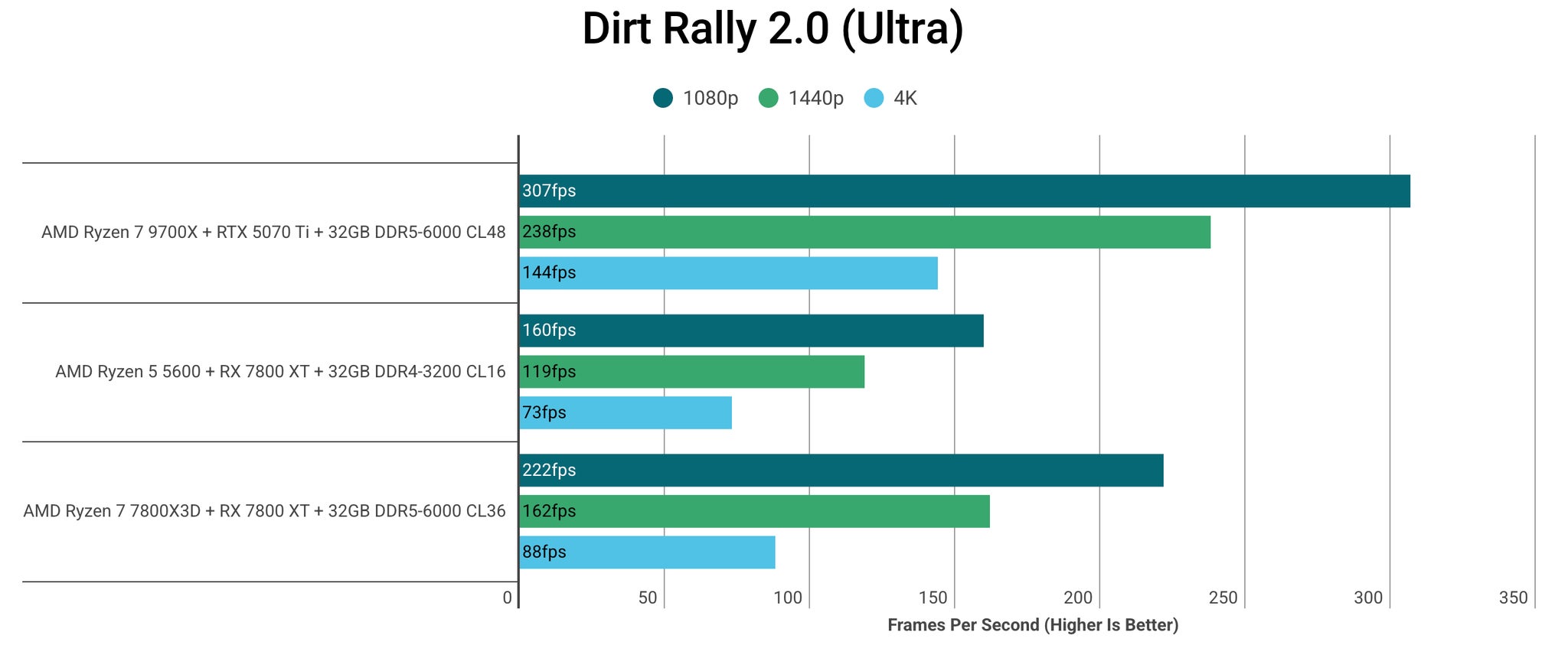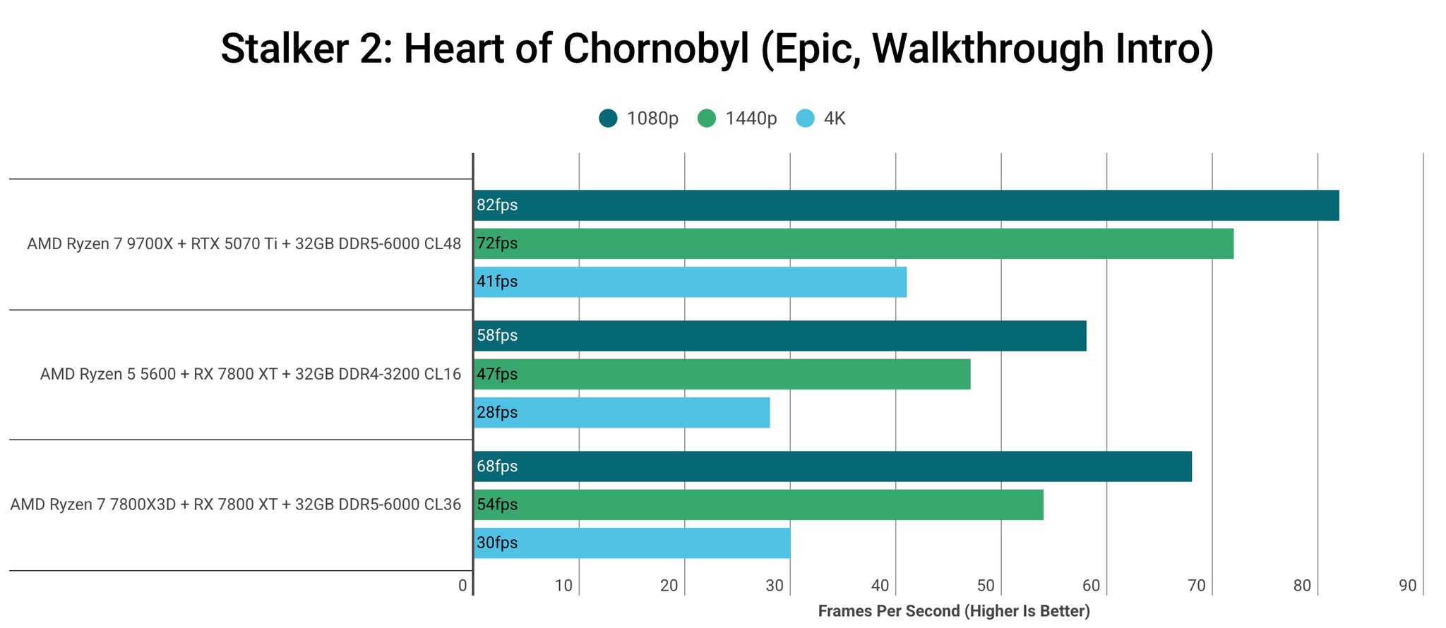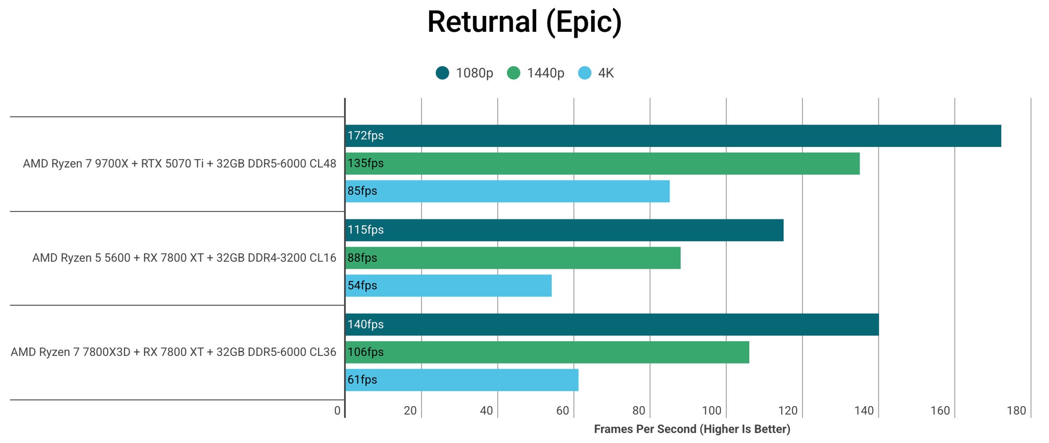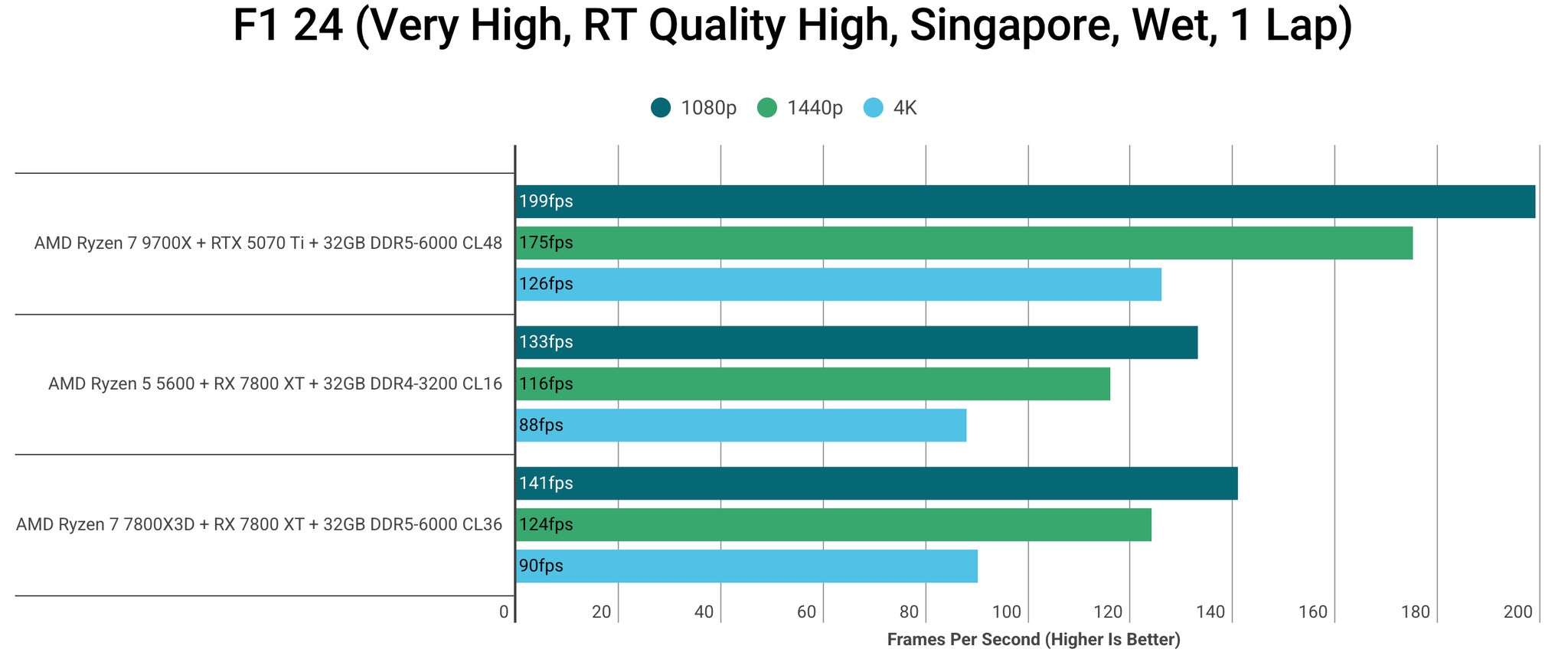 To provide some extra context, we also have the returning results from the 5600 and 7800X3D systems with an RX 7800 XT, as games were run at the same settings.