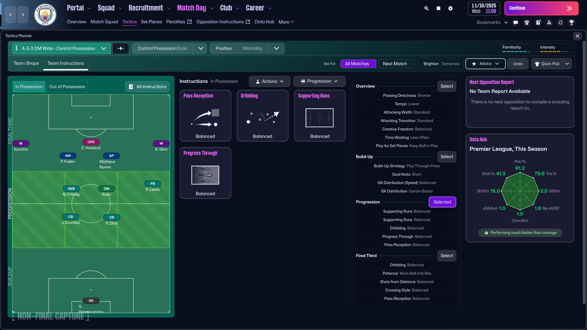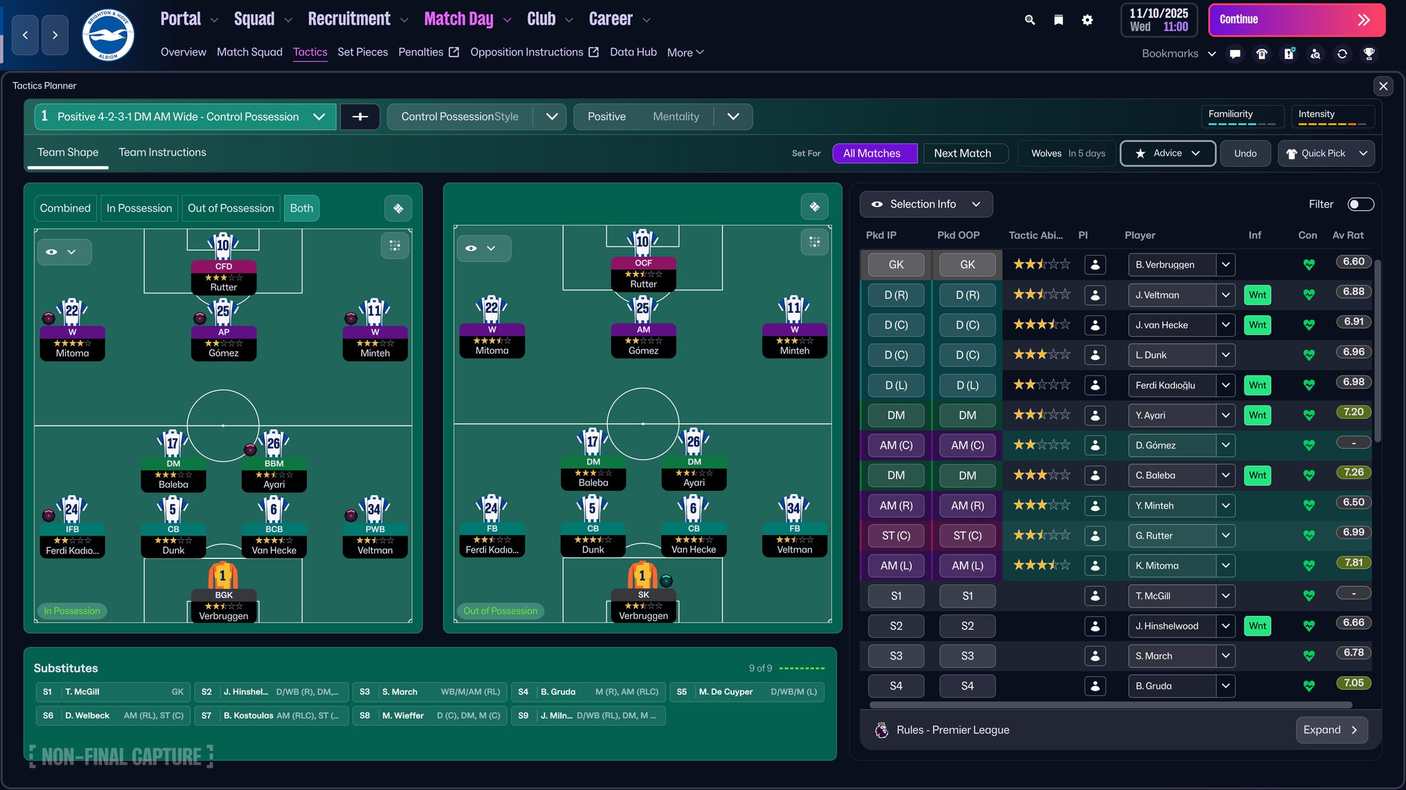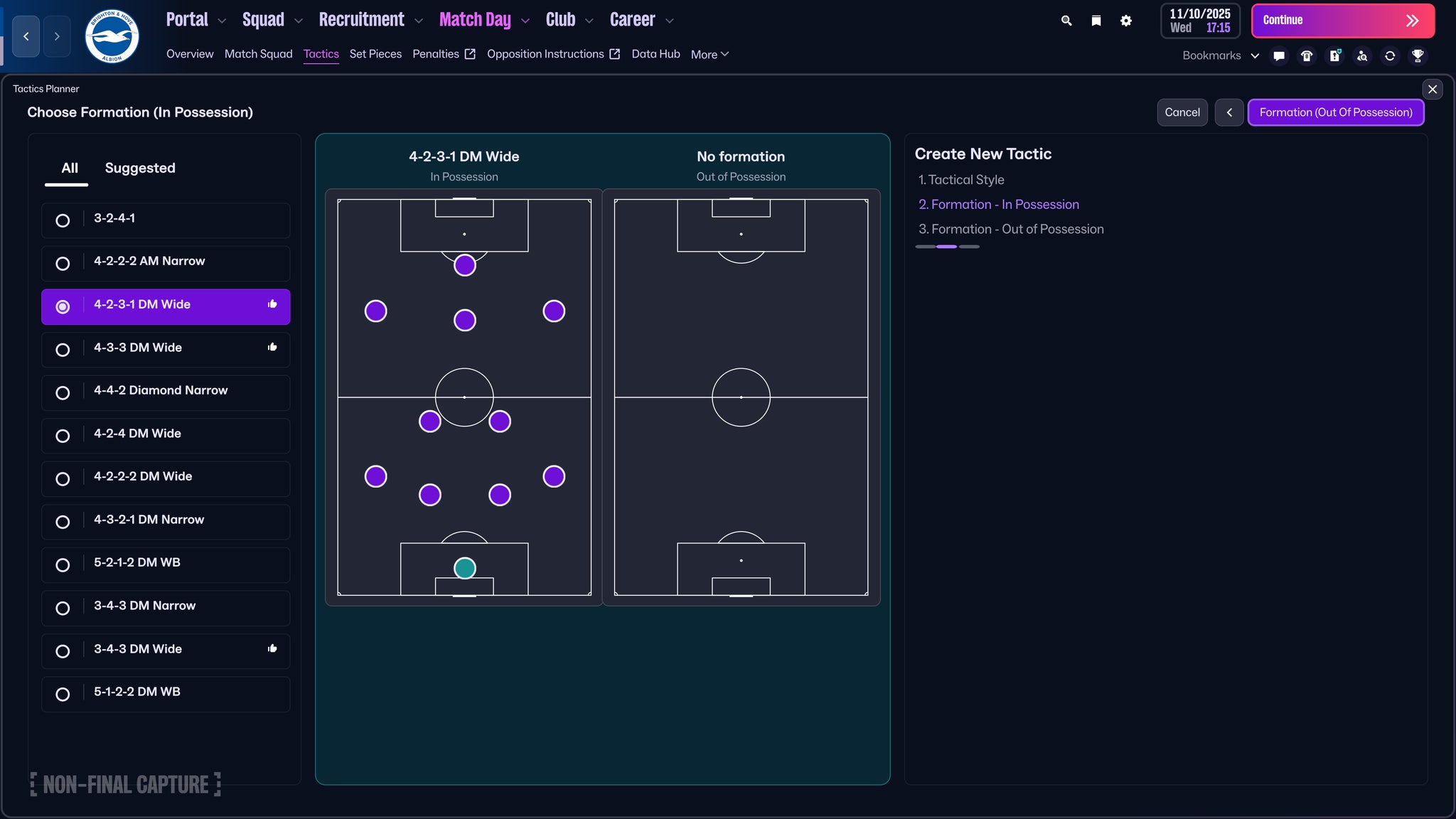 The team considered adding more roles which approximated that effect, but ultimately settled on splitting the two systems, as they’ve increasingly been done in the real world by those with a modern understanding of the game. Here in FM26, there are indeed new roles too on top of that, but they’re also split across in- and out-of-possession setups. An example: out of possession a player playing wide on the right can be asked to fall in line, track opposition attackers even deeper, or sit high and wide waiting for the ‘out ball’ to launch a counter-attack. Likewise, you can indeed have your CAM – in my case dear Bruno – playing as a 10 when in possession, then moving up to sit beside the centre forward to defend as a front two when you lose the ball.