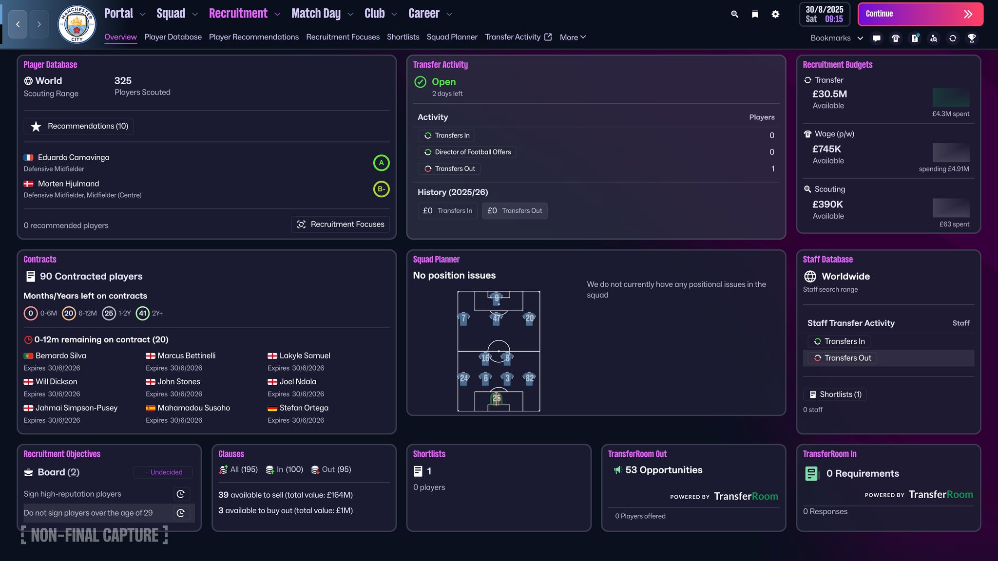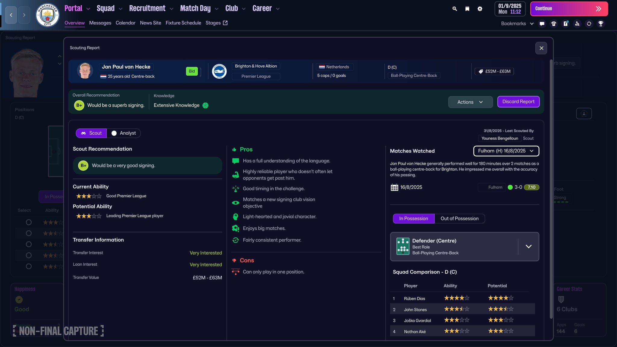 Some examples: text overlaps the UI in multiple places. The text for the tactics visualiser didn’t match the phases of play I selected. Players’ roles sometimes didn’t change in the different pages of the pop-up when I was trying to set them for in- and out-of-possession. Plus the warning bug and lack-of-back-button issues mentioned above, and many more. Likewise beyond bugs, and perhaps more significantly to FM26’s true success: some things just don’t quite work as well as they used to. Must-reply not-emails aren’t highlighted in red in the queue anymore, making it harder to skip to them directly to resolve whatever needs sorting before you can mash Continue once more. There’s no “i” button to hover over to quickly view a player’s attributes – something I realise now that I do all the time in the current game.